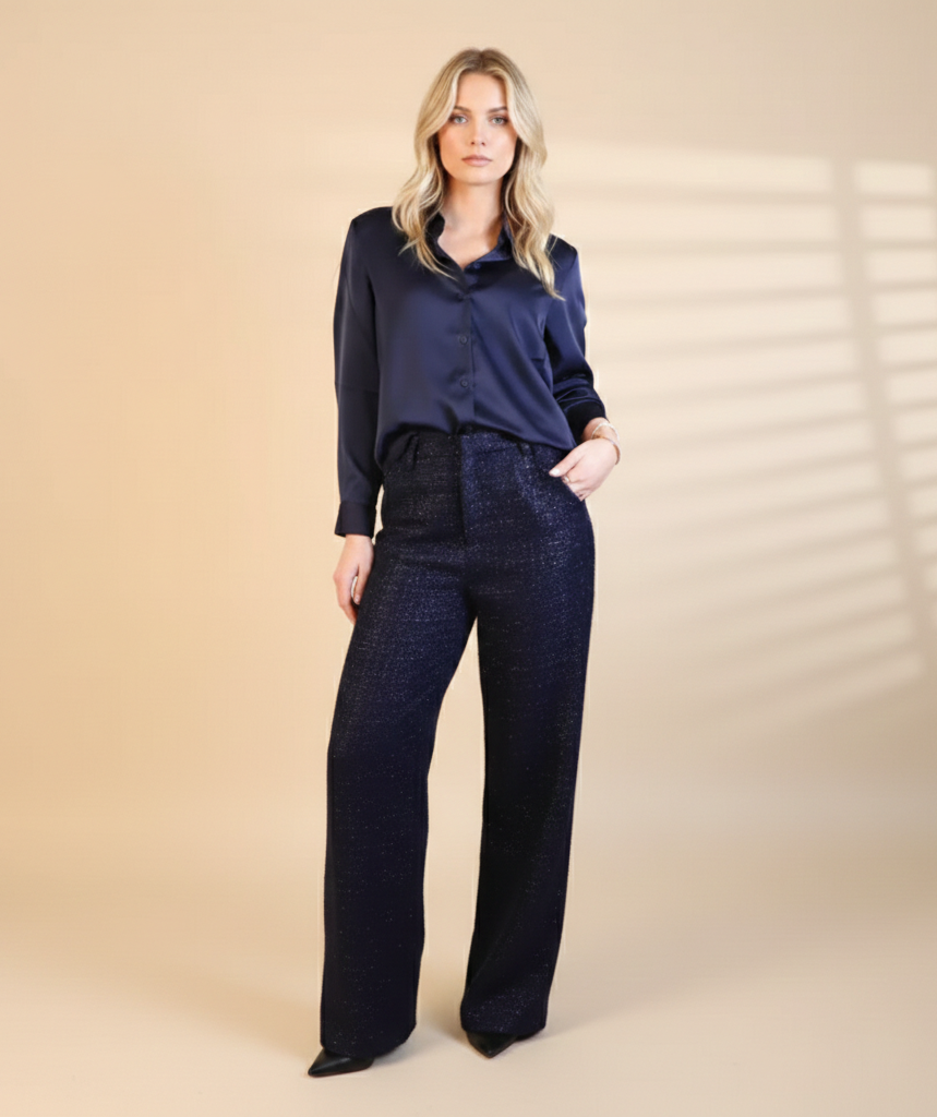 Donker blauwe broek met glitter, perfect te combineren met onze marine blouse. Mooie pasvorm. Voor werk en feest!