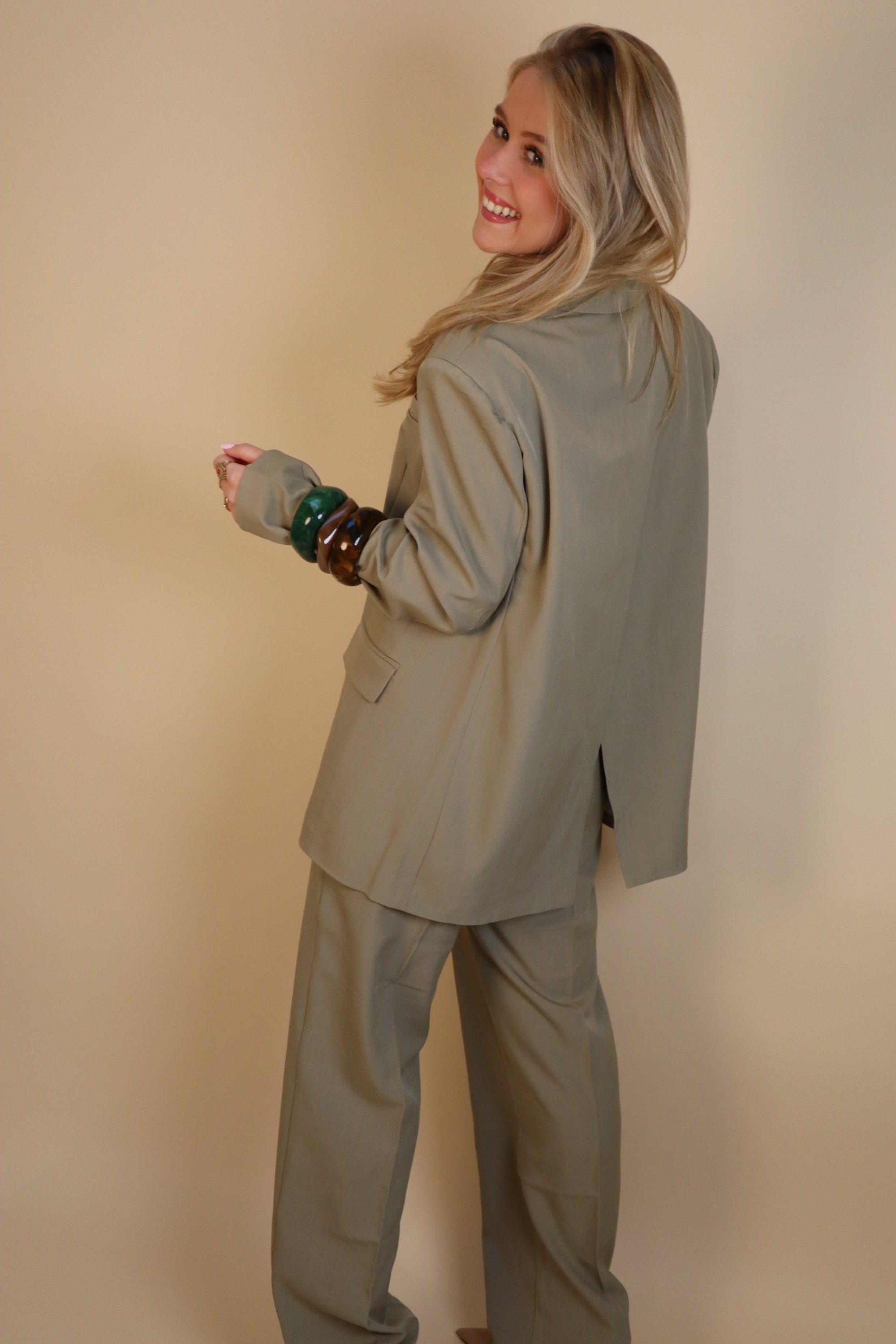 Lindo blazer verde fosco, perfeito para combinar com nossas calças. Ideal para todas as estações.