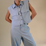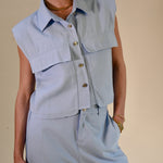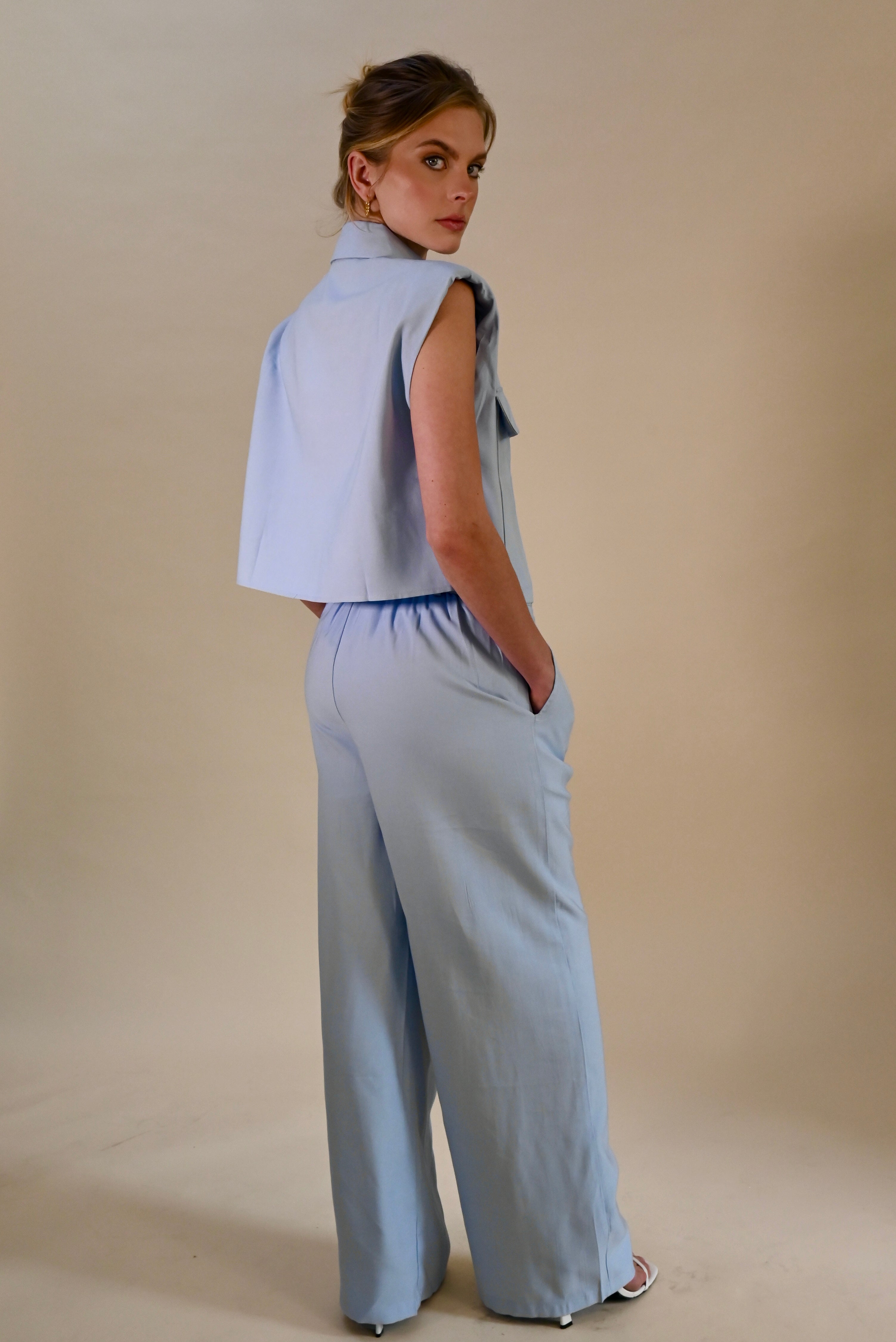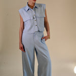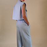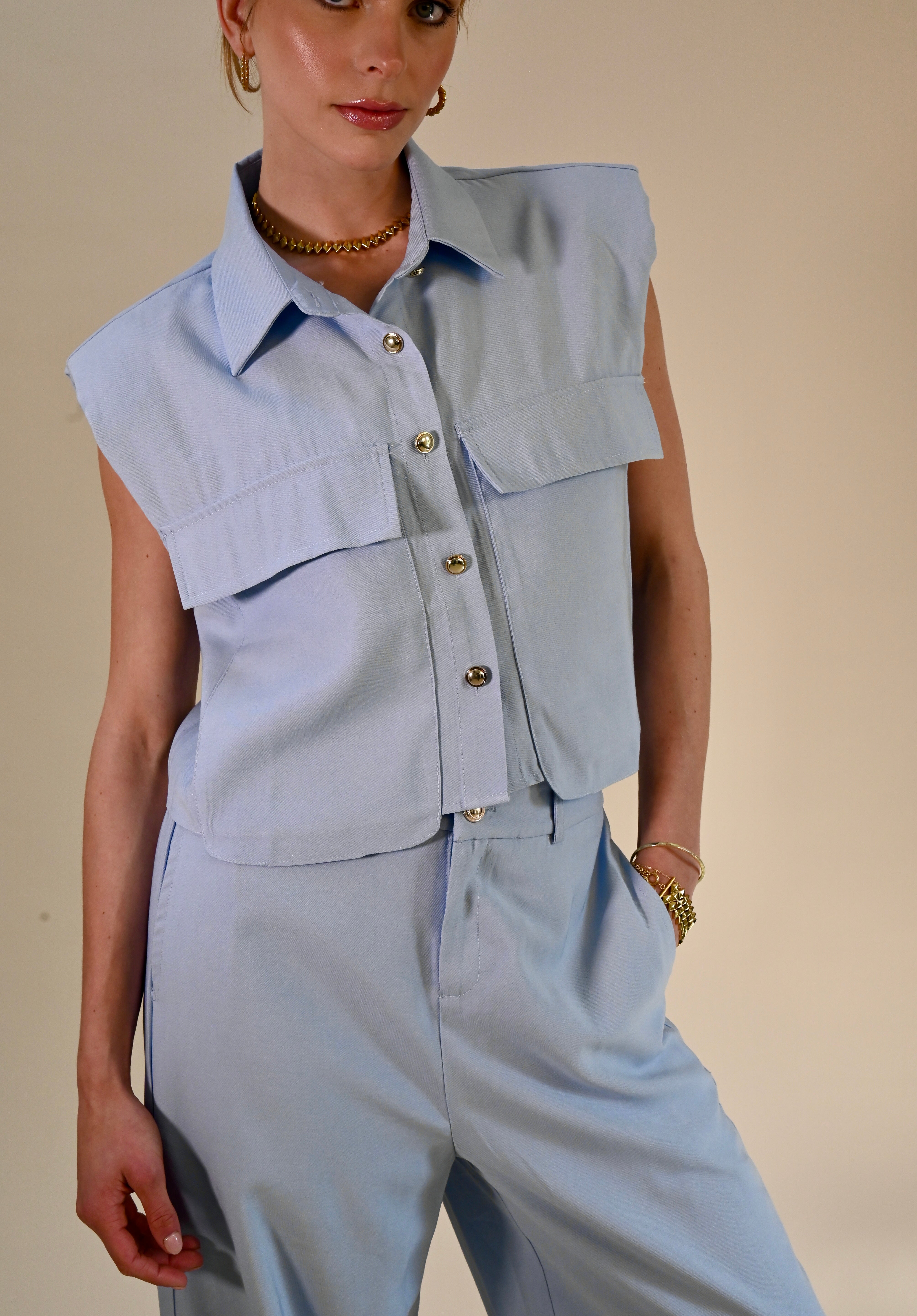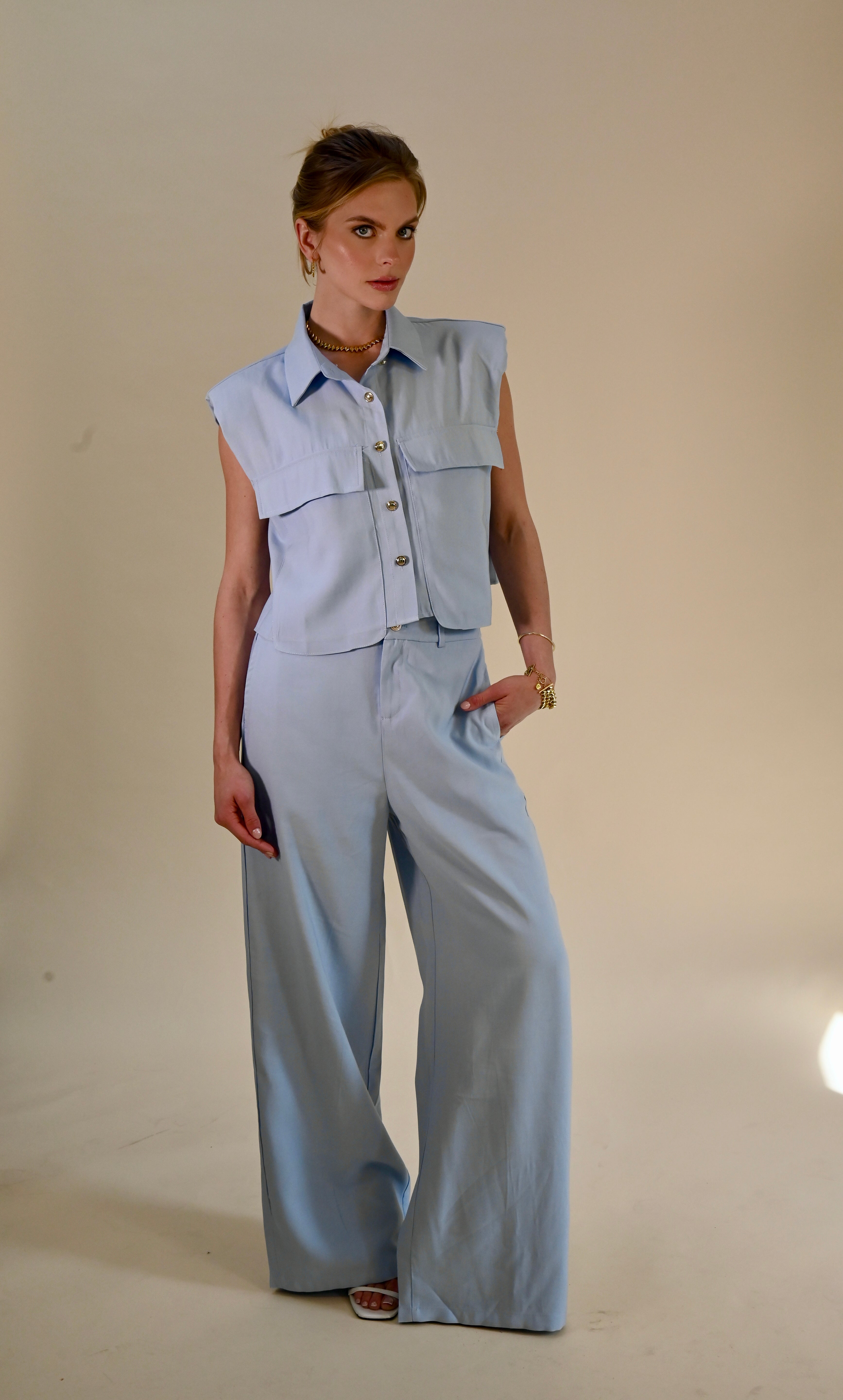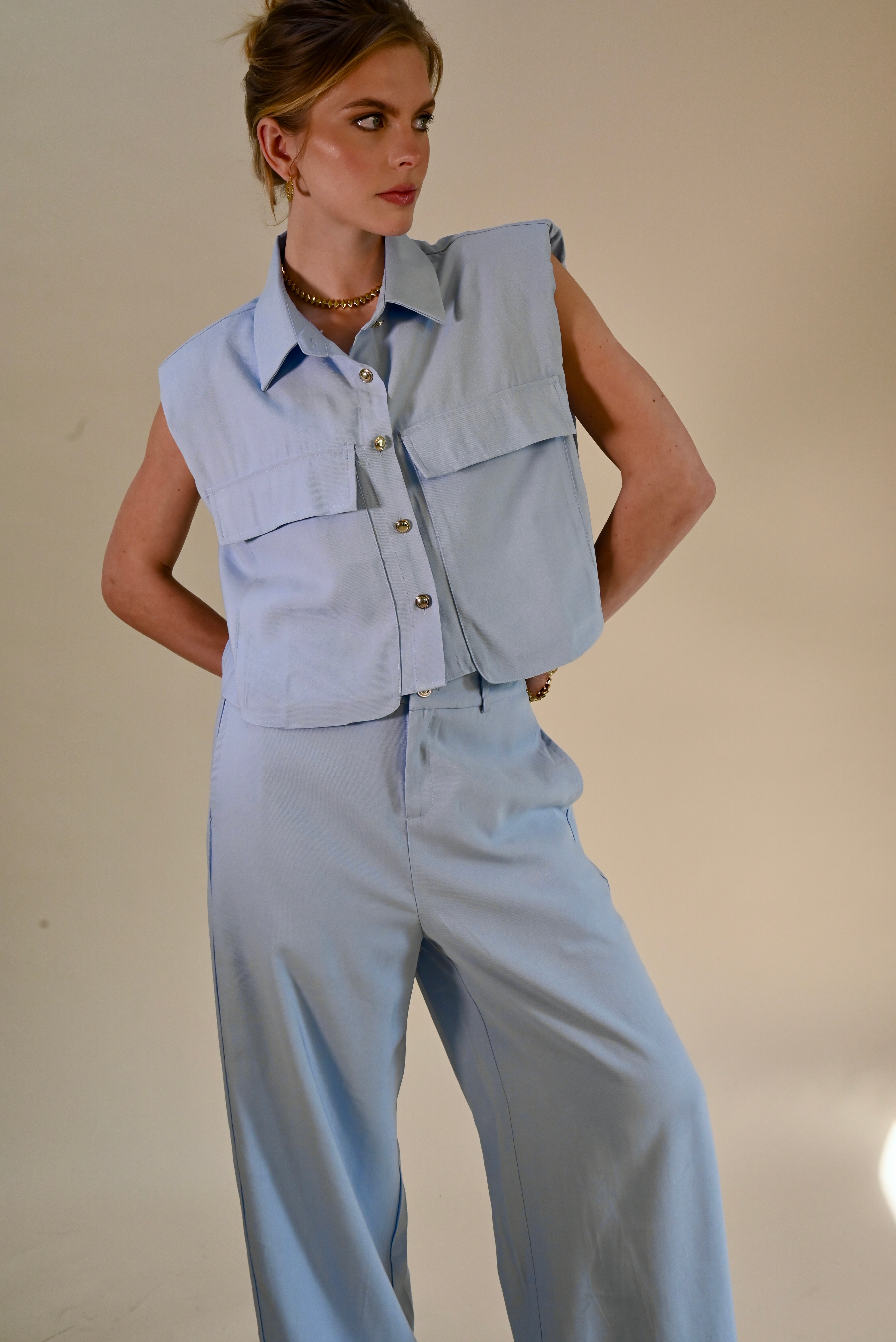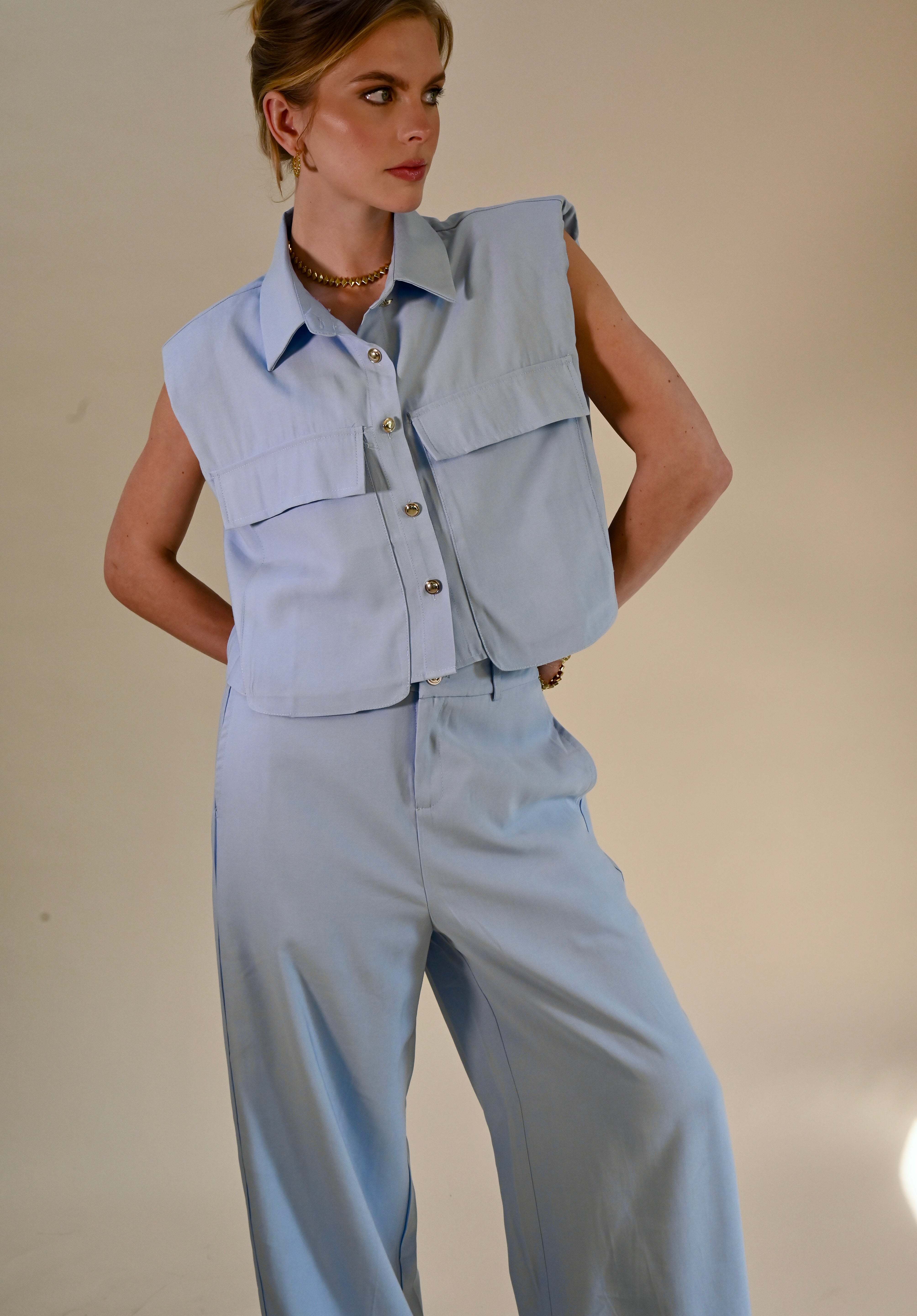 Deze stijlvolle lichtblauwe 2-delige set combineert comfort met een moderne, elegante uitstraling. De mouwloze blouse met subtiele kraag en decoratieve knopen geeft een verfijnde look, terwijl de bijpassende broek zorgt voor een ontspannen maar chique silhouet.